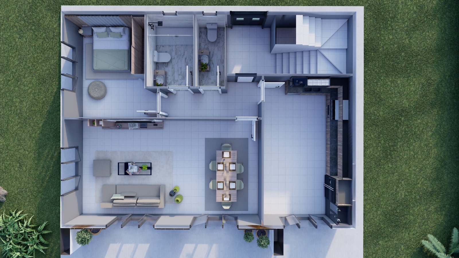 Alt katta yer alan son derece geniş salon ve mutfak alanı, evin kalbini oluşturur. Açık ve akışkan plan yapısı sayesinde salon, mutfak ve yemek alanı tek bir bütün gibi çalışır; bu da hem günlük yaşamda hem misafir ağırlarken maksimum konfor sağlar. Gün ışığını güçlü şekilde içeri alan cephe açıklıkları, mekânın olduğundan bile daha büyük algılanmasını sağlar.