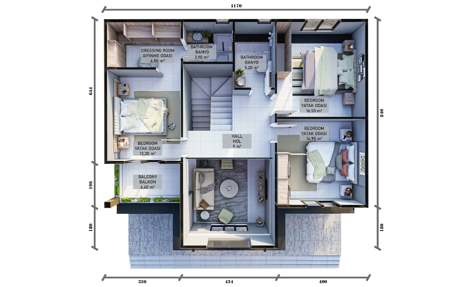 Üst katta konumlanan 4 yatak odası, aile bireylerinin her biri için ayrı ve konforlu bir özel alan sunar. Odaların ölçüleri ve yerleşimi, evin hiçbir noktasında sıkışıklık hissi oluşturmadan, rahat bir kullanım sağlar. Katlar arası net ayrım sayesinde alt kat sosyal yaşamı, üst kat ise dinlenme alanlarını temsil eder.
