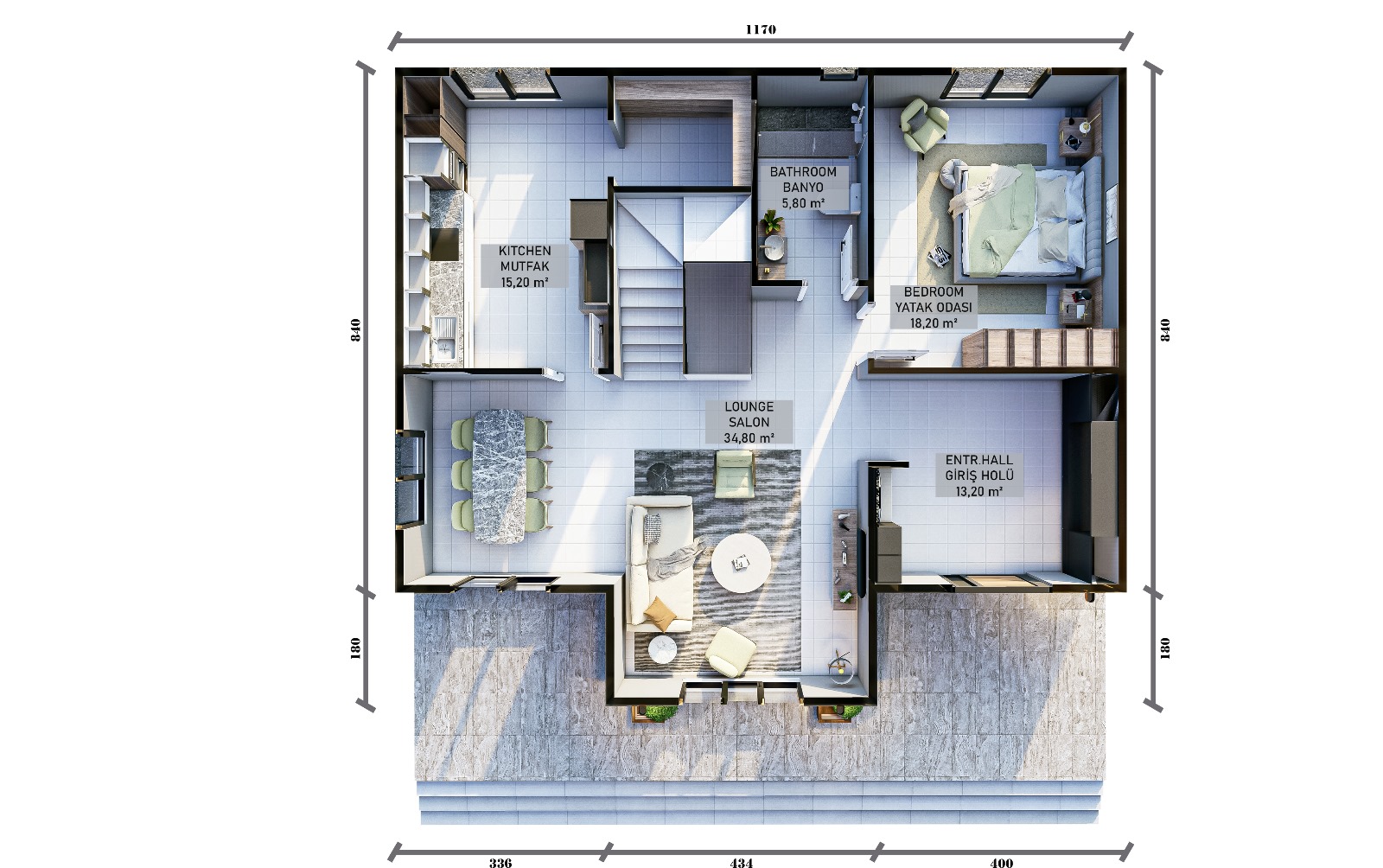 Alt katta yer alan geniş yaşam alanları, evin sosyal merkezini oluşturur. Salon ve mutfak hacmi, kalabalık aile yaşamını ve misafirli günleri rahatlıkla karşılayacak şekilde tasarlanmıştır. Açık ve dengeli plan yapısı sayesinde mekânlar birbirine akıcı biçimde bağlanır; ev içinde ferahlık ve düzen hissi sürekli korunur.