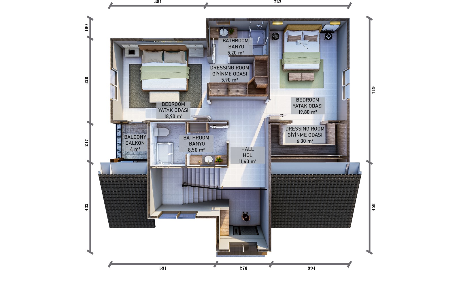 Alt katta ferah ve akıcı bir yaşam alanı sunulurken, üst kat tamamen özel yaşama ayrılmıştır. Geniş yatak odaları, her biri düşünülerek planlanmış giyinme odaları ve ebeveyn banyoları, evde yaşayan herkes için gerçek bir konfor alanı oluşturur. Bu planlama, kalabalık aileler ya da misafirli yaşamı sevenler için ciddi bir avantaj sağlar.