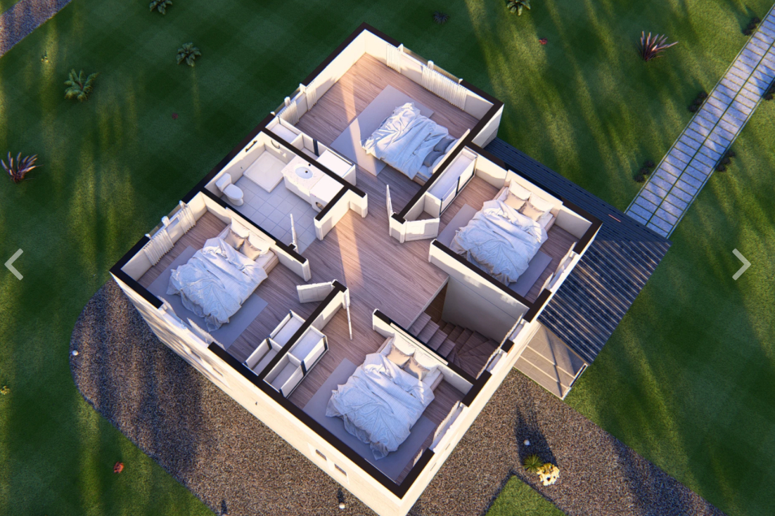 Üst katta yer alan yatak odaları, aile bireylerine özel, sessiz ve konforlu bir yaşam alanı oluşturur. Dengeli plan kurgusu sayesinde her oda ideal ölçülere sahip olup, mahremiyet ve kullanım kolaylığı ön planda tutulmuştur. Çatı formu ve galeri etkisi yaratan mimari detaylar, yapıya karakter kazandırırken iç mekânda ferahlık hissini artırır.