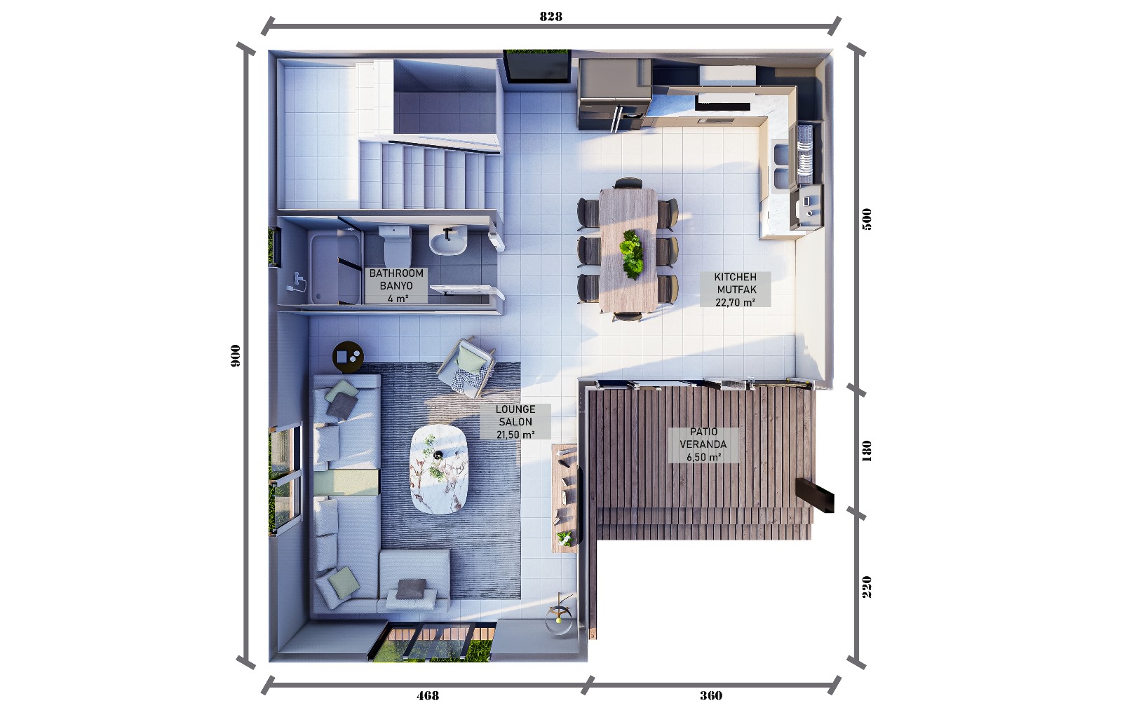 Zemin katta geniş ve aydınlık salon–mutfak alanı, misafir kullanımı için uygun bir banyo ve doğrudan bahçe ile ilişki kuran yaşam alanları yer alır. Açık plan tasarım, alanın daha ferah algılanmasını sağlarken aile içi etkileşimi güçlendirir. Bahçe ve teras bağlantısı, evin dış mekânla bütünleşmesini sağlar.