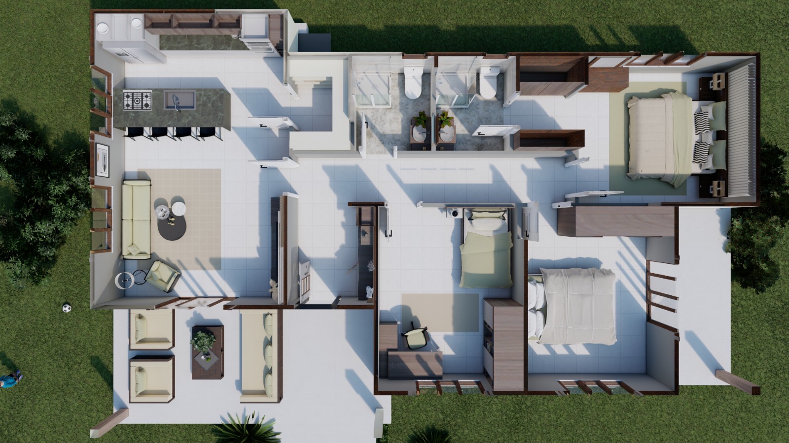 Evde yer alan 3 yatak odası, aile bireyleri için hem mahremiyet hem de esneklik sunarken, 2 banyo düzeni sabah saatlerinde yaşanan karmaşayı ortadan kaldırır. Salon ve mutfak alanı ferah bir bütünlük hissi yaratacak şekilde planlanmış, dış mekânla doğrudan ilişki kuran geniş veranda ise evin en güçlü yaşam alanlarından biri haline getirilmiştir.