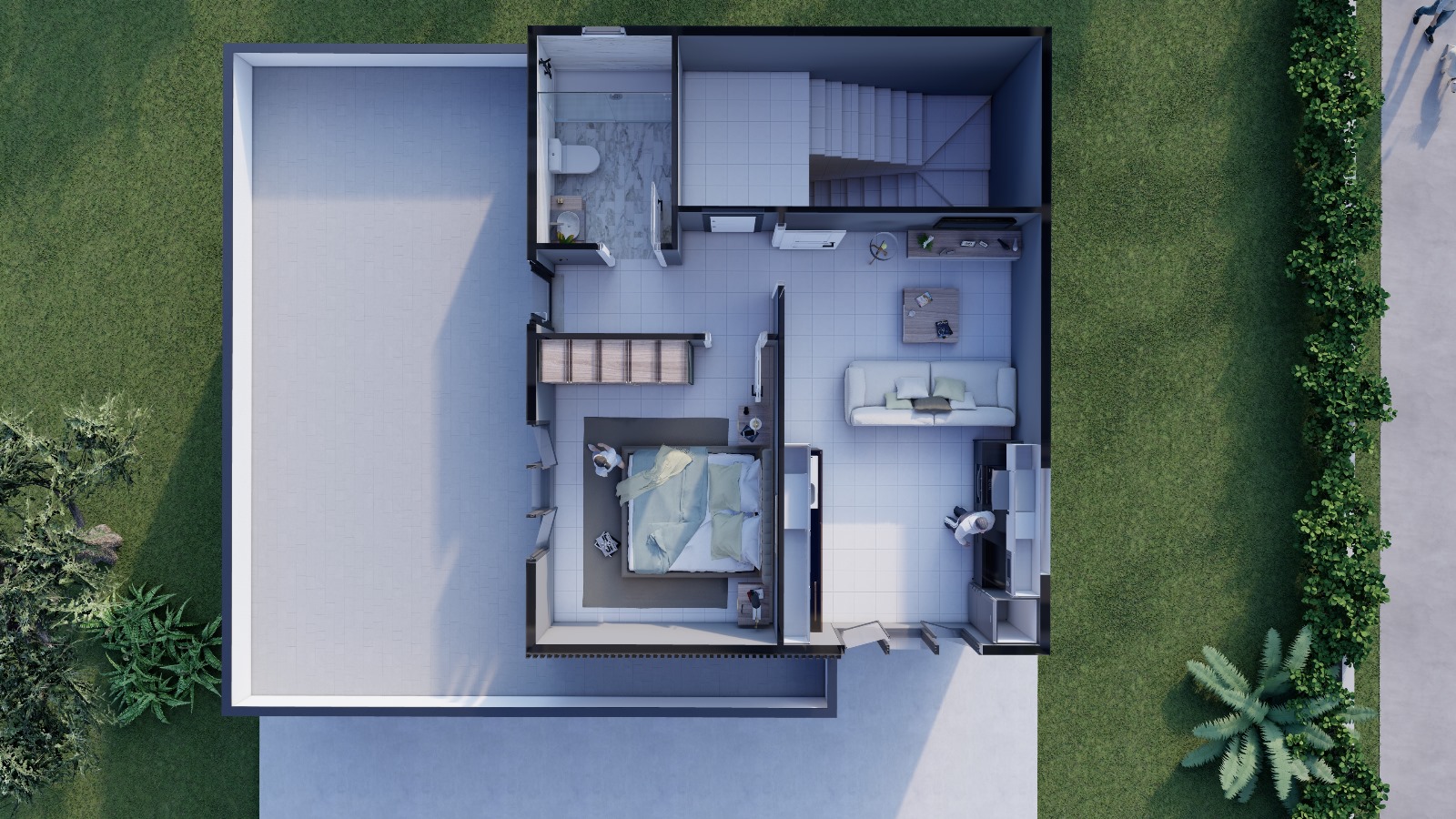 Üst katta konumlanan 2 yatak odası, evin daha sakin ve özel bölümünü oluşturur. Odaların konumlandırılması sayesinde alt kattaki sosyal yaşam ile üst kattaki dinlenme alanları net biçimde ayrılmıştır.