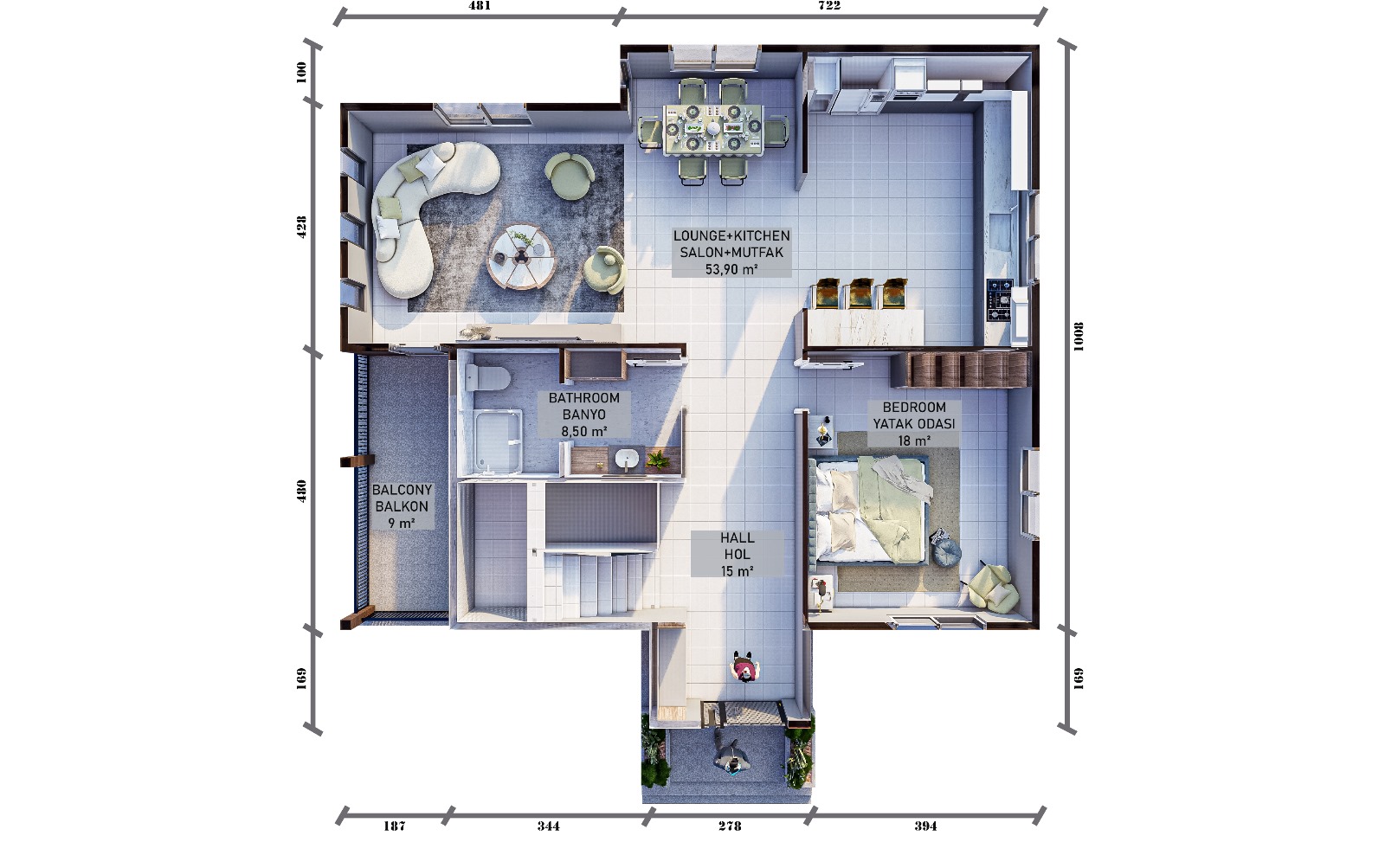 Geniş pencereler ve balkonlar sayesinde iç mekânlar gün ışığını maksimum seviyede alır; ev, doğayla sürekli temas halinde bir yaşam hissi sunar. Çelik yapı sistemi ise bu estetik kurguyu yüksek dayanım, uzun ömür ve güven ile destekler.